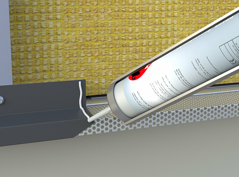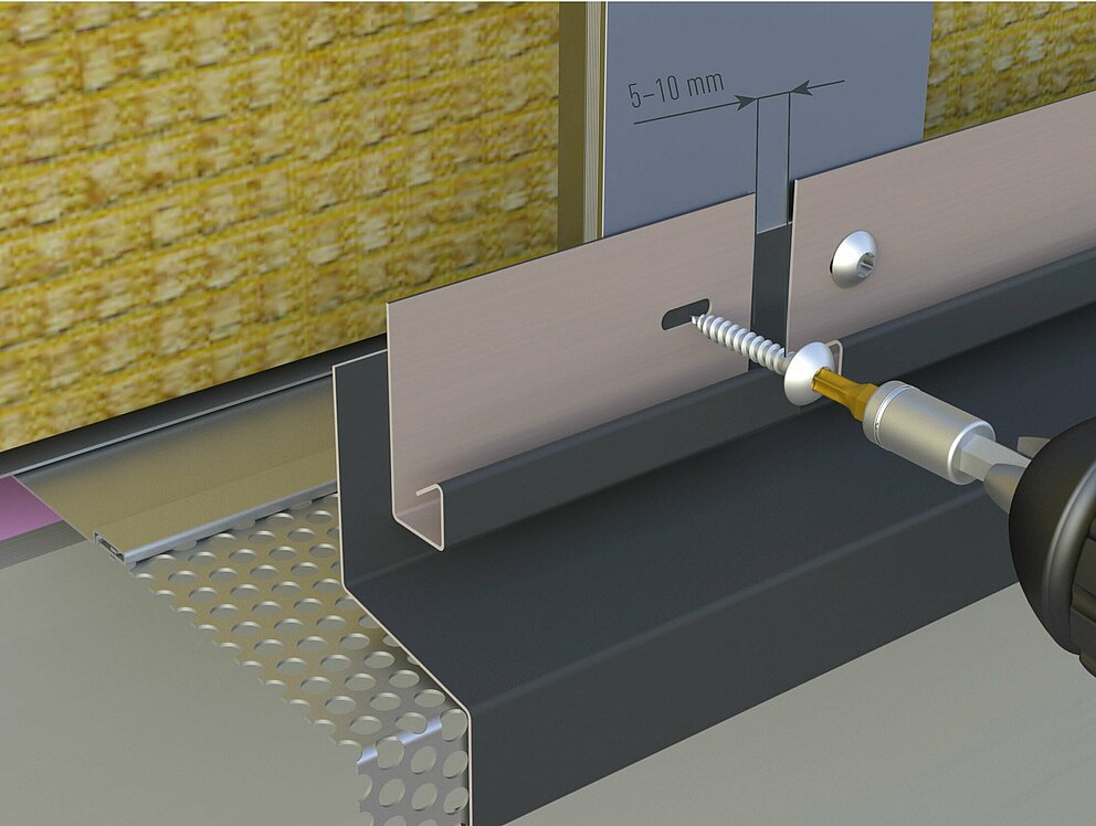 Bij grotere gebouwafmetingen mag u de startprofielen en het geperforeerde steekprofiel niet stoten vanwege de uitzetting van het materiaal. Houd een afstand van 5–10 mm aan voor het uitzetten van het materiaal (afhankelijk van de lengte van het startprofiel).